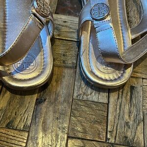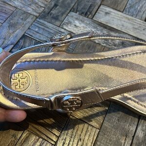 Tory Burch Minnie Travel Sandal Metallic Leather. Rose gold 654. Style 39641. Comes in box with Tory Burch Dust Bag. Lightly used—bottom sole, front/toe area & a couple of light marks on footbed. Size 9.5
