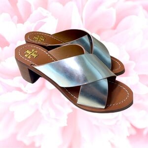 Tory Burch Montrose Stacked Block Heel in Silver, Size 6.5M