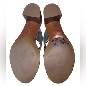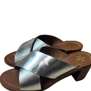 These stylish Tory Burch slides are made out of a patent leather material, and come in a silver color / solid pattern. Styling includes a criss-cross banded uppers. Rounded toe. Slip on-design with 2-5/8" block heel. Truly a gorgeous pair of Tory Burch slides! Gently used, and guaranteed to make an excellent addition to your designer wardrobe!