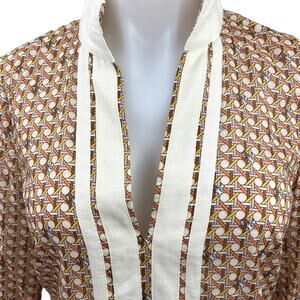 Tory Burch Multicolor Geometric Basket Weave Print Voile Tassel V Neckline with Stand Collar Long Sleeve Tunic Cover Up Top Size XS