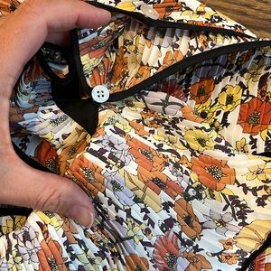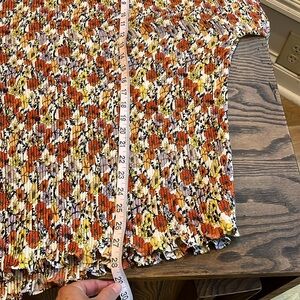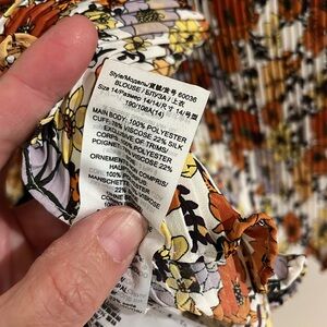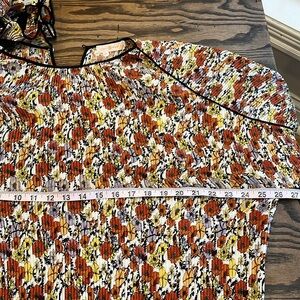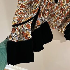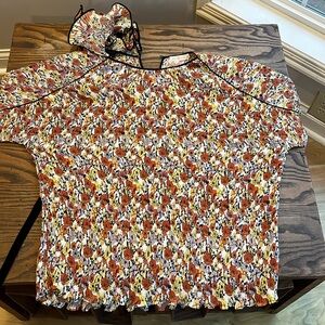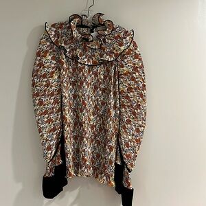 Elegant blouse with ruffle details. Features a multicolor floral pattern. Perfect for a chic look.