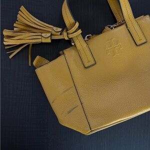 Elegant mustard leather handbag with signature Tory Burch interior. Features a zip closure and logo details.