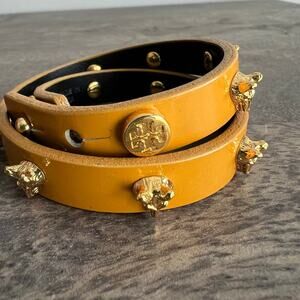 Tory Burch Mustard Yellow Gold Tone Fox Head Wrap Leather Bracelet