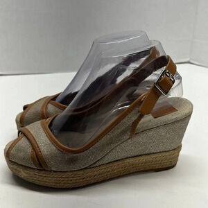 Tory Burch Mya Espadrille Wedge Heels Pump Peep Toe Slingback Brown Sparkle 7