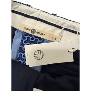 This is a beautiful pair of Tory Burch Sport Blue Patterned stitch front seam Straight Leg Pants SZ 2. The material is a stretchy medium weight 89% Tactel Nylon, 13% Elastane and the pocket bags are 100% Cotton. 2 front diagonal pockets and 2 slit back pockets one with a button. Excellent Condition. Please see pictures for a better description.