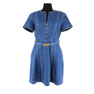 Tory Burch Nadia Triple Washed Blue Denim Belted Dress 12 Gold Logo Short Mini