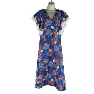Tory Burch Natalie Floral Midi Resort Dress Ruffle Trim Blue Size 0