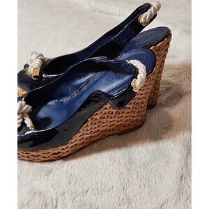 Tory Burch Navy Blue Patent Rope Bow Wedge Slingback Peep Toe Sandals Womens 10