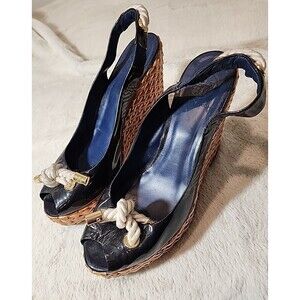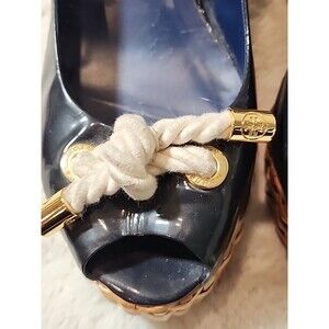 Tory Burch Navy Blue Patent Rope Bow Wedge Slingback Peep Toe Sandals Womens 10