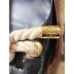 Tory Burch Navy Blue patent leather wedge slingback sandals. These stylish peep-toe shoes feature a nautical rope bow accent with gold-tone Tory Burch hardware on the vamp and heel straps. The espadrille-style woven wedge offers a comfortable lift. Perfect for a beach vacation, a summer wedding guest, or a chic daytime outing.