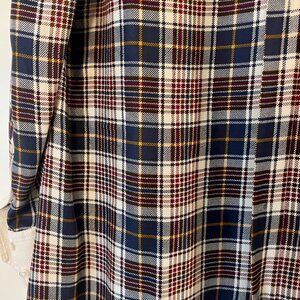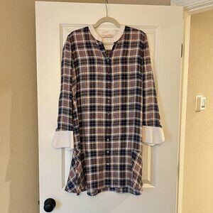 Tory Burch Navy Blue Plaid Drop Waist Button Up Dress, Long Sleeves