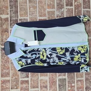 Stylish long sleeve button-up shirt with a floral pattern. Features a mix of navy blue, light blue and green colors.