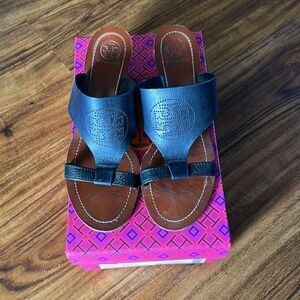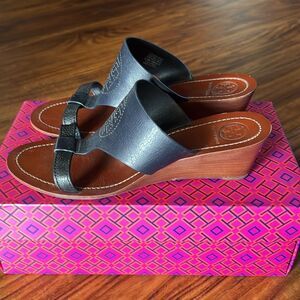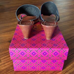 Tory Burch Navy/Black Perforated Logo Wedge Size 8.5 In great condition, please see pictures and ask any questions! Has small rub mark under toe on one shoe, see picture! Comes with original tissue paper and box. Purchased for $328