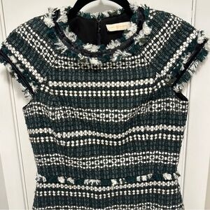 Tory Burch Norfolk Striped Tweed Dress 2 Cap Sleeve Fit & Flare Green Blk Wht