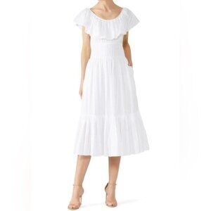 Tory Burch Off Shoulder White Cotton Seersucker Striped Ruffle Dress