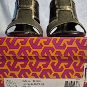 Tory Burch olive green with metalic gold gladiator style heels. Absolutely gorgeous 😍 but my feet can't stand high heels anymore 😢 My loss is your gain. Barely used (Saks sticker still on the sole). Size 10 but fits more like a 9.5