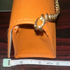 Elevate your style with the Tory Burch orange flip top eyeglasses case and chain. The soft case has a magnetic closure. Perfect for protecting your eyewear. Have a stress-free day. 😇