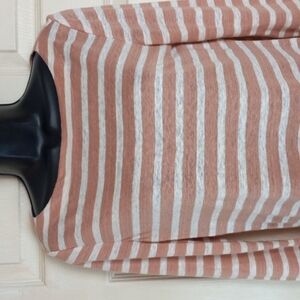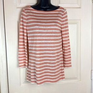 Stylish crew neck sweater. Features orange and white stripes. Perfect for casual wear.