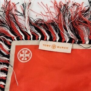 Add a bold pop of color to your wardrobe with this stunning Tory Burch oversized silk scarf. Featuring vibrant orange, pink, red, and navy geometric stripes and eye-catching fringe trim, this luxurious wrap doubles as a shawl or statement accessory. The iconic Tory Burch logo is subtly placed in the corner, and the scarf is crafted from smooth silk for an elevated look. It has a few minor stains, which are reflected in the price. A perfect piece for layering during travel, chilly evenings, or just adding flair to your outfit.