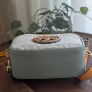Stylish crossbody bag by Tory Burch. Features a vibrant yellow top, tan front, and blue sides. Perfect for versatile wear.