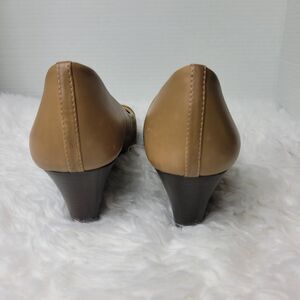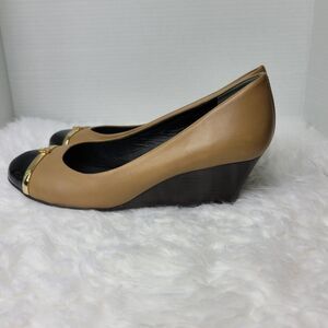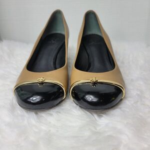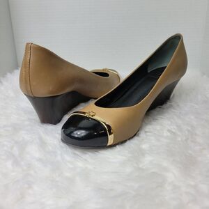 Tory Burch Pacey Cap Toe Wedge Pump Shoe Tan Beige Leather Gold Logo Accent Good Condition See Pictures For More Details.