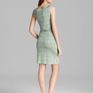 A contoured V-neckline and flowing bodice give way to a trim-fitting pencil skirt in this soft, checkered silk dress.