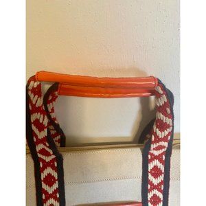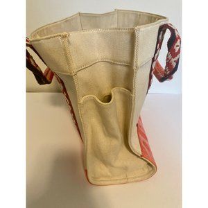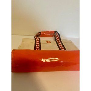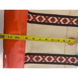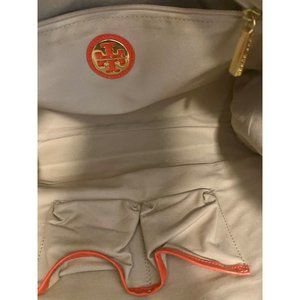 Tory Burch Patent Leather Canvas Tote Bag. Pre-owned excellent condition, minor mark on the orange patent, pictures provided. Open top with magnetic snap closure. Exterior back slip pocket, 2 side slip pockets. Interior zip pocket and muti-function slip pockets. Fabric lining. Gold tone hardware.