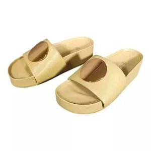 Elevate your shoe game with these stylish Tory Burch Patos slip-on sandals. Crafted with solid yellow leather and a comfortable platform heel, these sandals are perfect for any occasion - whether you're traveling, going to a party, or just running errands. The slip-on closure makes them easy to wear, while the rubber outsole ensures durability. These sandals feature a medallion accent and are part of the Tory Burch Patos product line. They are available in US shoe size 5 and have a medium width. The insole is also made of leather, providing added comfort. These sandals are a must-have for any fashion-forward woman and are sure to make any outfit stand out. New without box.