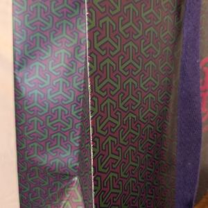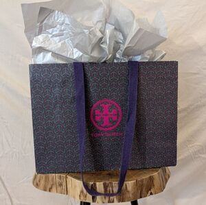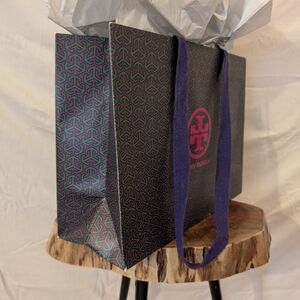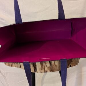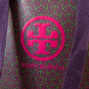 Stylish Tory Burch large shopping bag with a purple/green pattern and purple handles. Features a hot pink logo. Some minor wear on the corners.