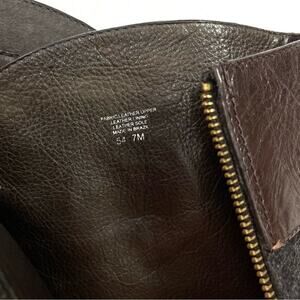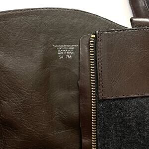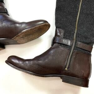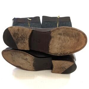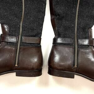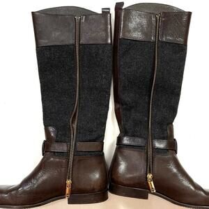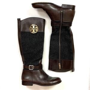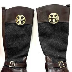 Classic riding boot in dark brown leather and charcoal gray flannel. Has gold Tory Burch logo details. Zip closure.