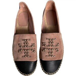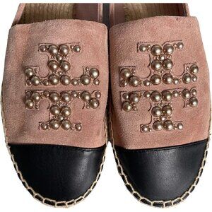 Keywords: Tory Burch espadrille, pearl embellished flats, pink suede shoes, summer slip-ons, cap toe espadrille, designer flats, boho chic shoes, vacation style, resort fashion, classic preppy footwear, spring shoes, beach espadrilles, luxury flats size 10, suede espadrille shoes, casual chic loafers, Tory Burch, pearl logo espadrilles, pink suede flats, suede espadrilles, designer slip-ons, flat espadrille shoes, summer shoes, casual chic, preppy footwear, resort wear, vacation style, coastal look, signature logo shoes, soft suede, embellished flats, round toe espadrille, feminine style, lightweight shoes, boho prep