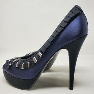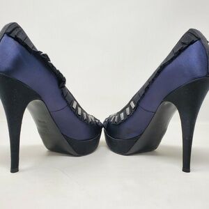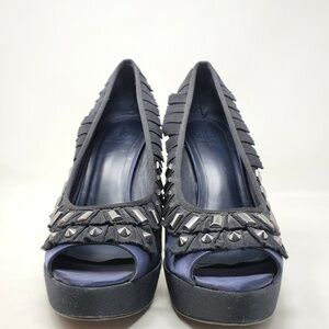 Tory Burch Peep Toe Heels Women Size 8.5 M Ruffles Metal Studs Black Navy Blue