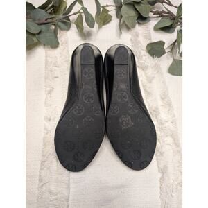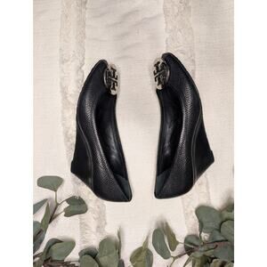 Tory Burch peep toe wedge in black leather. Have been worn, please notice imperfections as pictured. Perfect to wear with your favorite pair of jeans or dress.