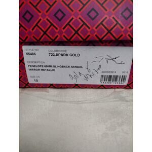 Box label text: "Penelope 65MM Slingback Sandal Mirror Metallic"; handwritten note reads "Gold & White"