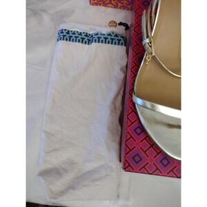 Logos/Markings: Tory Burch embossed footbed logo; branded hardware at strap; outsole brand stamp