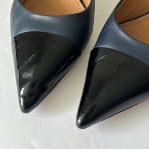 Navy leather with black patent leather cap toe. 3 inch heel.