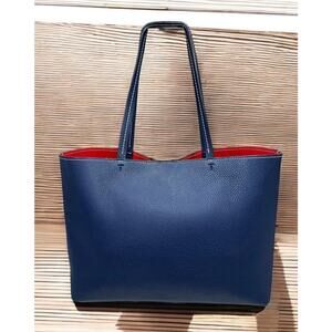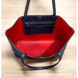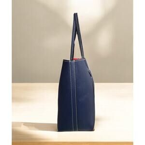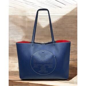 This Tory Burch Perforated Leather Logo Tote Bag is a classic look and style by Tory Burch! Featuring pebble leather in the Royal Navy/Cherry Apple colorway with the iconic perforated double T logo, this large tote is both stylish and functional with more than enough room for all of your necessities, including a lap top. If you love the quality and preppy style of Tory Burch, then this is a must have for your collection!
