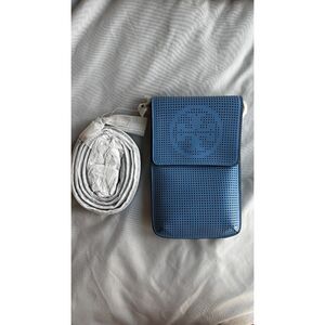 Tory Burch Cross Body Blue perforated phone holder. New & unused. Comes with box & dust bag.