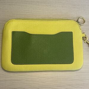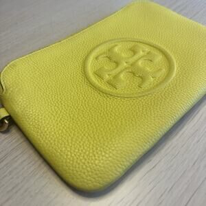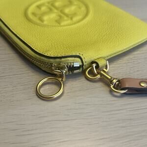 The Tory Burch Perry Bombe Color-Block Top Zip Leather Card Case Wristlet Mini Bag is a stylish and functional accessory for women. Made from high-quality leather in a bold yellow/green color, this card case features a solid pattern with the Tory Burch logo as accents. The wrist strap adds convenience for hands-free carrying, making it a practical choice for storing cards and cash on the go. With its sleek design and durable material, this mini bag is perfect for adding a touch of luxury to any outfit.