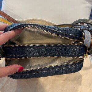 Tory Burch Perry Bombe Mini Crossbody Bag Royal Navy Raffia and Leather Bag
