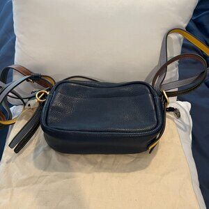 Features: Adjustable and Reversible Strap, Dual Zippered Sections, Gold Hardware