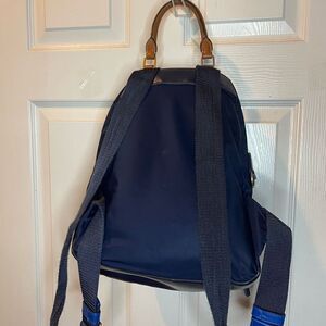 Tory Burch Perry Navy Blue Nylon small backpack royal blue leather trim leather tan top handle strap.front zipper pocket,top zipper the inside lining has a side zipper and a side pocket.Pre owned in good used condition clean no tear.missing the side the detachable Tory Burch medallion.see all pictures any questions please message.F1