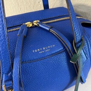 Tory Burch satchel, Perry bag, pebbled leather tote, crossbody satchel, designer satchel, Tory Burch blue satchel, structured satchel, luxury satchel, Tory Burch bag, cobalt satchel