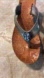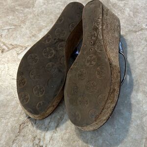 Tory Burch, cork wedge sandals. Pewter leather straps with Tory Burch medallion. Wedge measures 3 inches. In good condition. Size 5.