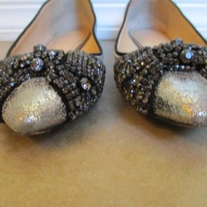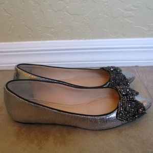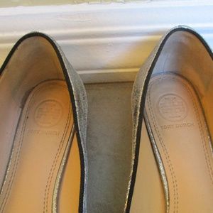 Tory Burch Pewter/Black Vanessa-32148450 Flats Women Size 6.5 M Eur 37. The uppers are super clean and look great. The toes are pointed and are not scuffed up at all. It doesn't look like any of the stones in the bow are missing. The insoles are super clean and only show some light wear. The soles show some wear but it is all very even. They are a great deal they are on sale right now for 150 with a 295 msrp.