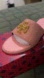 Elegant pink slides with gold logo detail. Perfect for casual elegance.