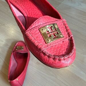 Tory Burch pink leather loafers. Used condition but reflected in price and lots of life left.