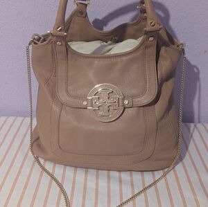 Chic Tory Burch shoulder bag in rich brown leather. Features elegant gold accents and a stylish design. Perfect for any occasion.