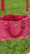 This is a two toned pink leather handbag by Tory Burch. Features: gold hardware/ button closure/ interior pockets with cloth lining/ adjustable shoulder strap