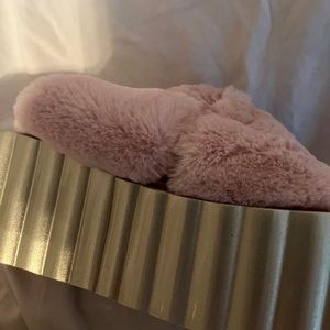 Stylish platform sandals with plush pink straps. Features a gold-toned sole. Perfect for casual outings.